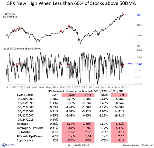S&P 500 continues to be rejected around the 2120 level. And each subsequent attempt at new highs has brought with it less and less buying pressure. We continue to see the deterioration of breadth across multiple indicators and have talked about this at length over the last several months. One gauge that continues to illustrate this point is the % of stocks above their 50 day moving average. This has steadily declined since November.