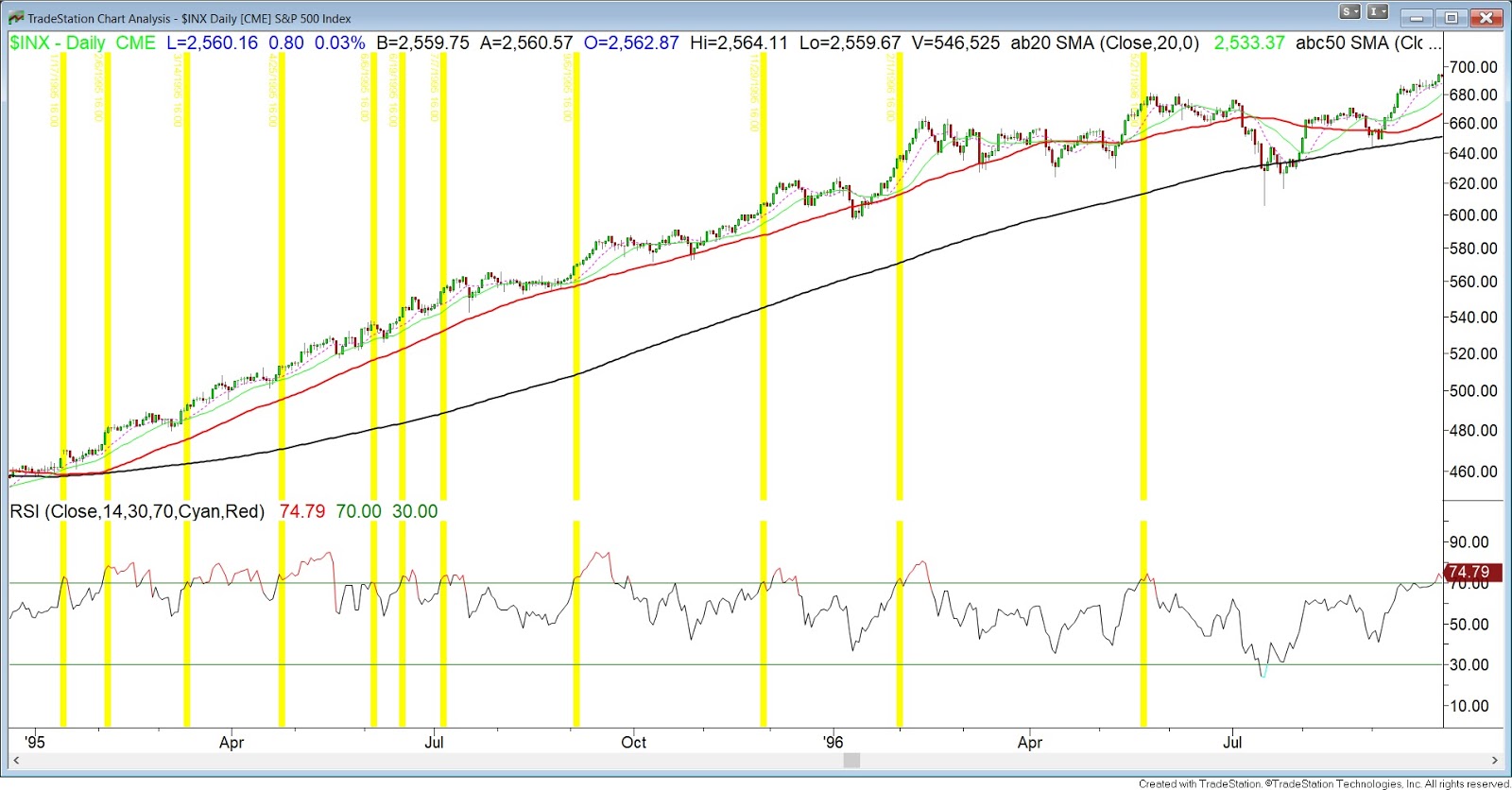 Below is a chart of the S&P with a simple 14 day RSI. We know from historical data that an overbought RSI doesn't necessarily mean we are due for weakness. In some instances it is forecasting future strength and in other cases it anticipates potential pitfalls. The data going back to 1960 shows no statistical edge going out a few weeks or months trying to predict an overbought RSI. In previous posts we have referred to prior strong trending years for comparison purposes. We still believe these to be true and why we are highlighting this below. 1995 was one of the strongest trending years in recent past and we can see that the RSI stayed overbought for much of the year while the S&P trended higher. The 2013-14 market had multiple instances of an overbought RSI all the while the market trended higher for months. This year is shaping up much in the same fashion as these two years. What we have noticed is that in most cases when the 14-day RSI became overbought the S&P went on to consolidate or pullback in the near future. As with any indicator it is not full proof but it is something that we watch and heightened our risk metrics.